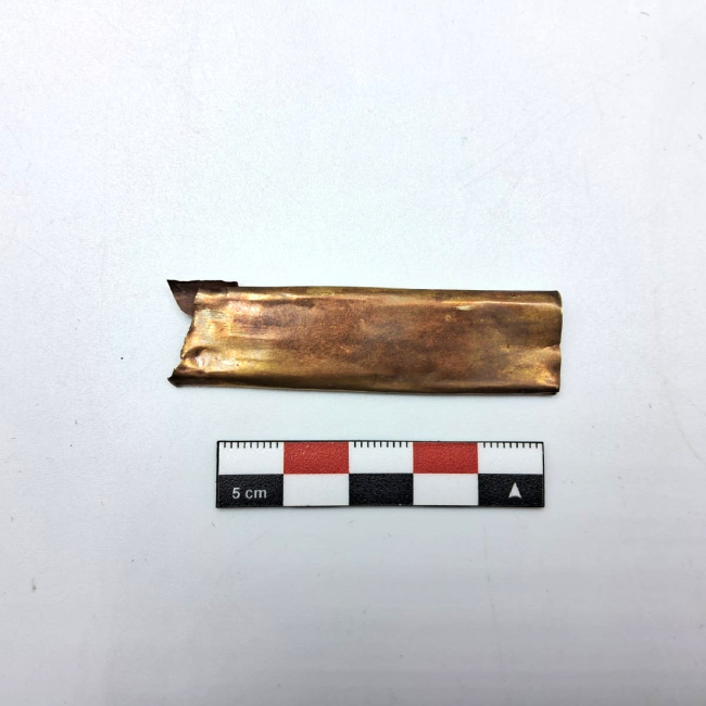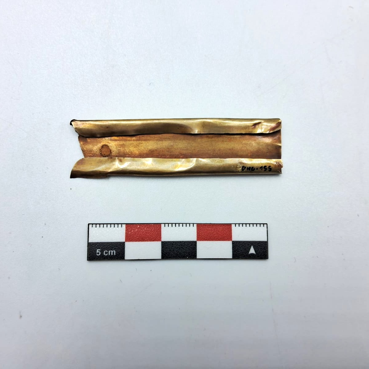 Artefacto de metal utilizado como adorno capilar para peinados con trenzas. Está confeccionado en base a una lámina de forma rectangular vertical, sobre la cual fueron doblados su extremos laterales, formando una estructura tubular. Las esquinas son redondeadas en la parte superior y rectas en la inferior.