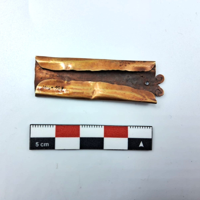 Artefacto de metal utilizado como adorno capilar para peinados con trenzas. Está confeccionado en base a una lámina de forma rectangular vertical, sobre la cual fueron doblados su extremos laterales, formando una estructura tubular. Las esquinas son redondeadas. En el extremo superior presenta una decoración compuesta por dos espirales que sobresalen de la placa y un calado circular dentro de la placa.