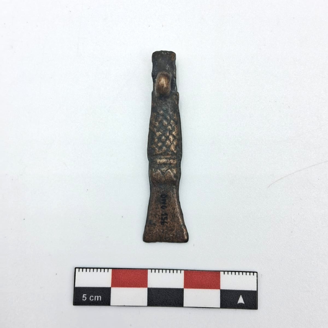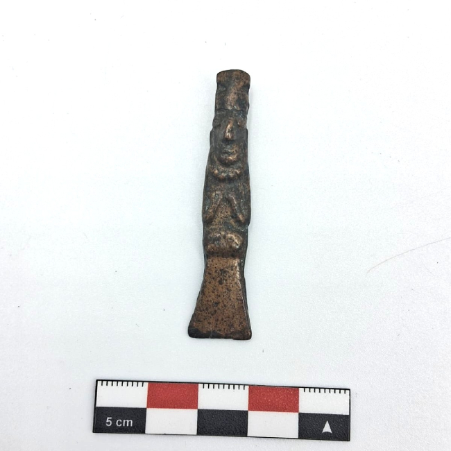 Adorno capilar metálico con motivo antropomorfo. Su morfología es alargada y presenta relieves que configuran el motivo antropomorfo. El extremo superior corresponde a una cabeza esquematizada, con rasgos faciales modelados en bajo relieve (nariz prominente, indicación de ojos y boca) y un collar. Sobre la cabeza se observa un elemento cilíndrico o tocado, que prolonga el eje vertical de la pieza. En la zona media se desarrolla el cuerpo antropomorfo, representado de manera esquemática, con indicación de brazos flexionados sobre el torso y un leve volumen en el abdomen. El extremo inferior se ensancha formando una terminación trapezoidal plana. La cara posterior presenta una superficie mayormente plana y alargada, siguiendo la misma morfología general de la pieza. En el extremo superior se observa la prolongación del elemento cilíndrico que conforma el tocado y un inciso reticulado que se extiende por el cuerpo. Se observa también en la parte superior una protuberancia con un agujero en el centro por donde van las amarras del adorno.