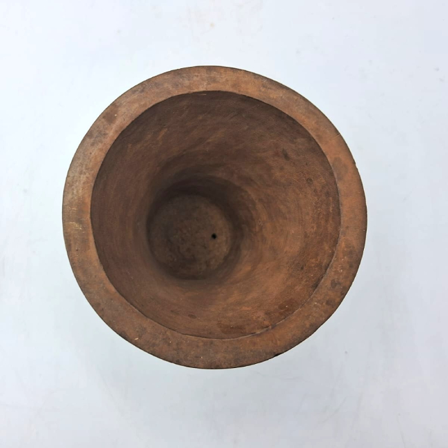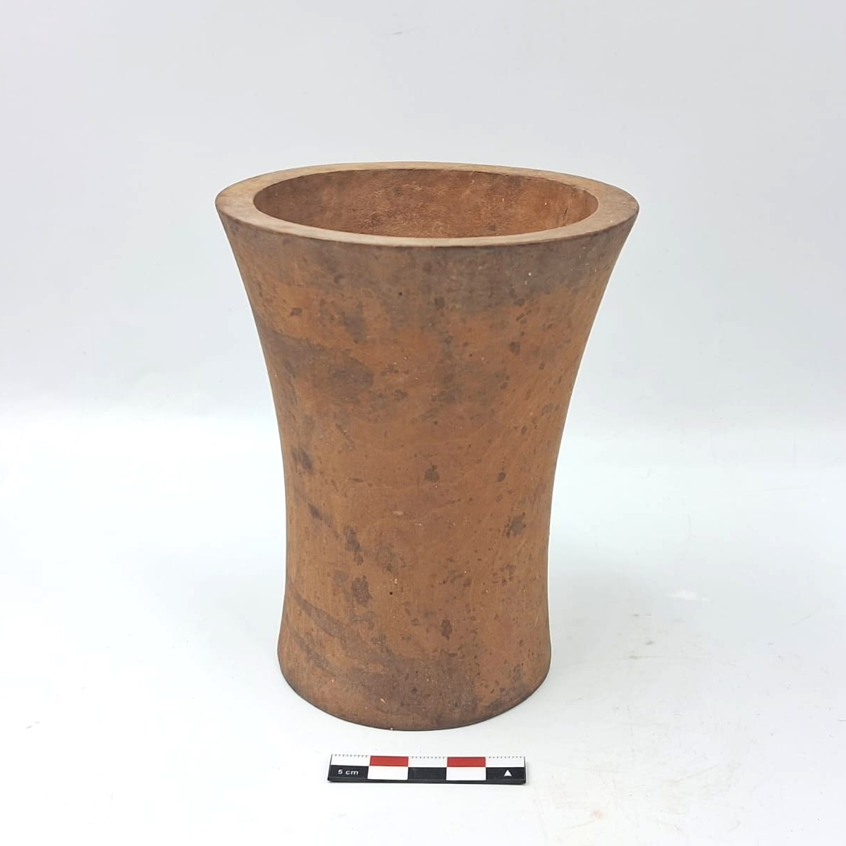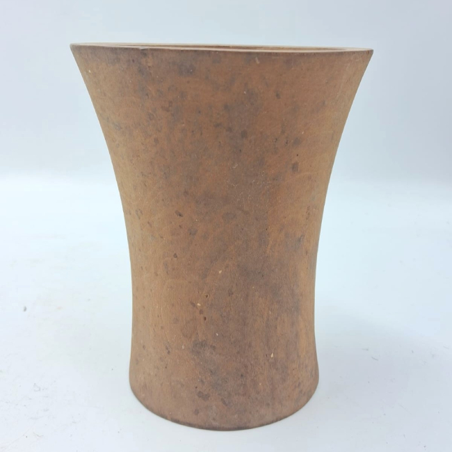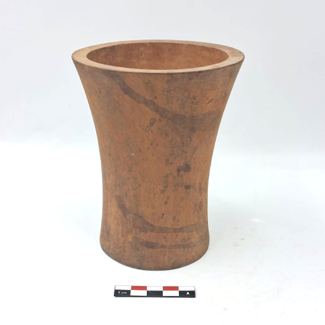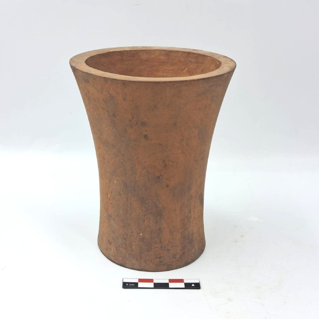 Contenedor de madera de forma abierta y contorno simple. Presenta una forma general hiperboloide. Los bordes son evertidos de labio plano y la base plana. La superficie exterior fue pulida.