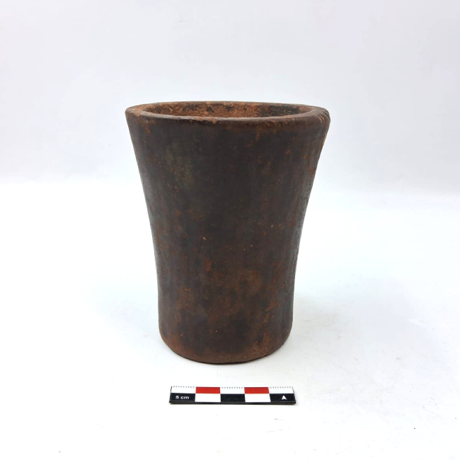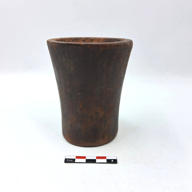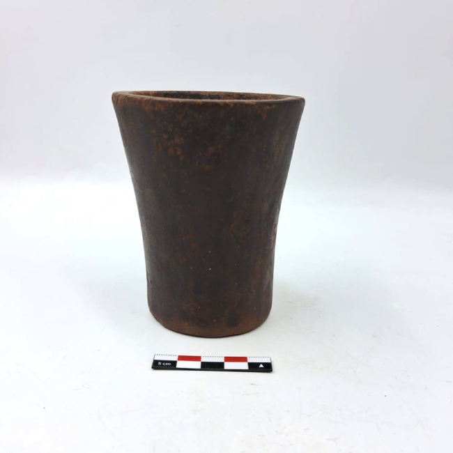 Contenedor de forma abierta y contorno simple. Presenta una forma general troncocónica invertida. Los bordes son evertidos de labio plano y la base plana. La superficie exterior fue pulida.
