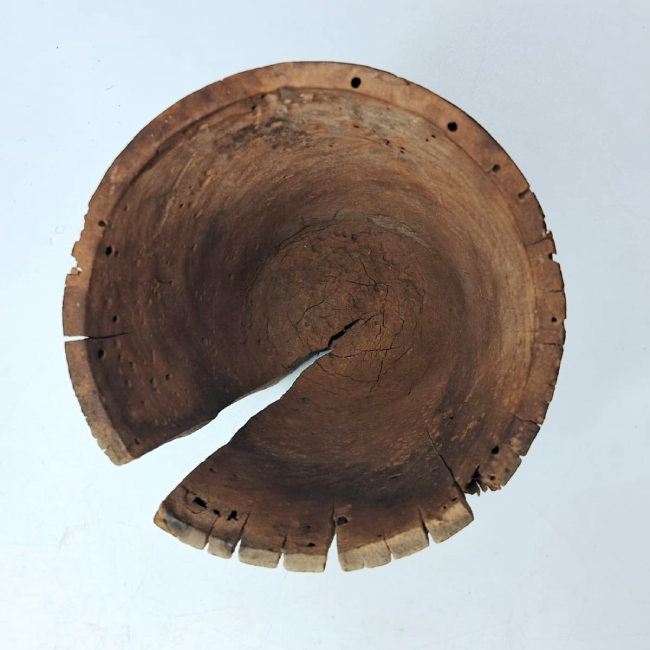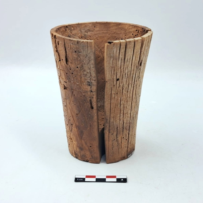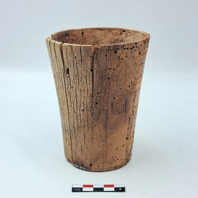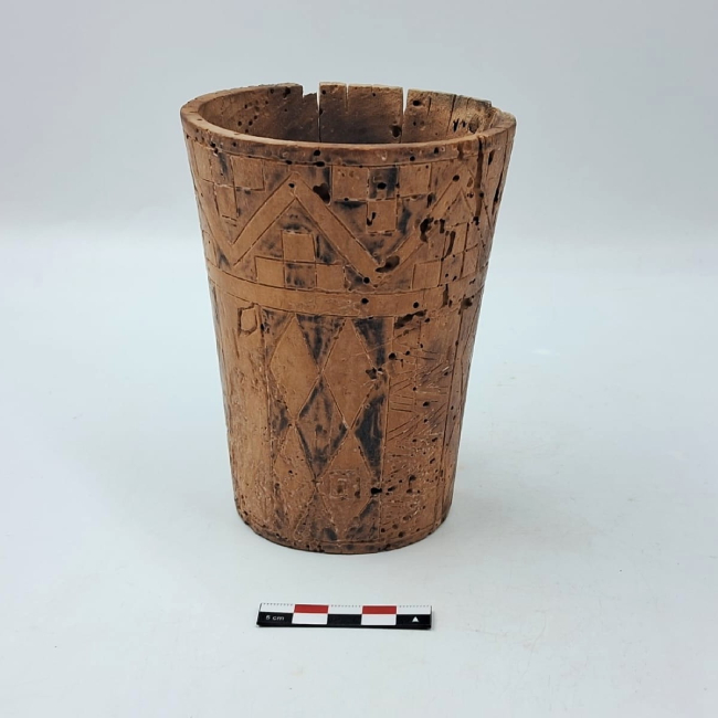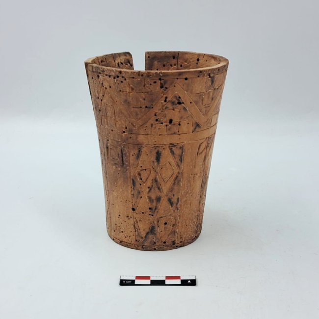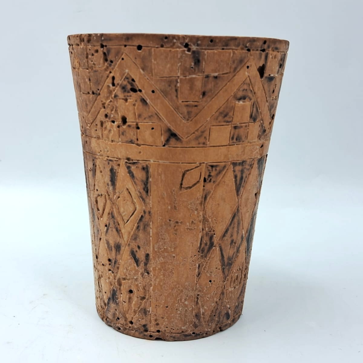Contenedor de forma abierta y contorno simple. Presenta una forma general troncocónica invertida. Los bordes son evertidos de labio plano y la base plana. La superficie exterior fue pulida y prograbada. El diseño está compuesto por una banda anular en la parte superior del cuerpo, la cual consiste en un ajedrezado linealmente delimitado que contiene un banda en zigzag en el medio (motivo a). Esta banda anular está separada del resto de los motivos del cuerpo mediante una banda delgada sin decoración a modo de anillo(motivo b) . En la parte inferior del cuerpo se observan 6 paneles verticales decorativos. Se identifican 3 paneles de mayor grosor con rombos verticales (motivo c) los cuales son intercalados por paneles mas estrechos de motivos distintos. Se observa un panel con un espiral aislado (motivo d), un panel con un rombo aislado (motivo e) y un panel con un motivo en zig-zag vertical (motivo f).