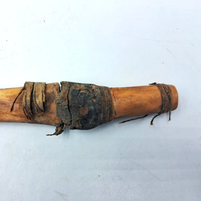 Objeto de forma tubular elaborado en una tibia de guanaco pulida y embarrilada con un cordel de fibra de camélido con torsión en z. Este artefacto fue utilizado como contenedor y presenta dos tapones de madera en ambos extremos.La tibia no presenta las epífisis puesto que estas fueron cortadas para colocar los tapones. En la superficie se observan sectores con tejido.