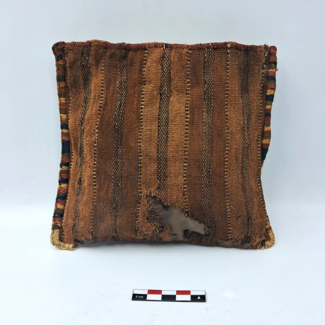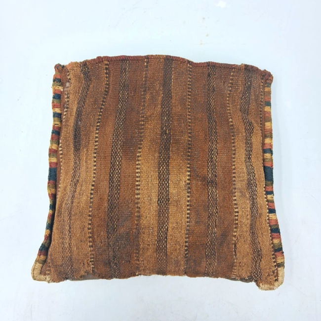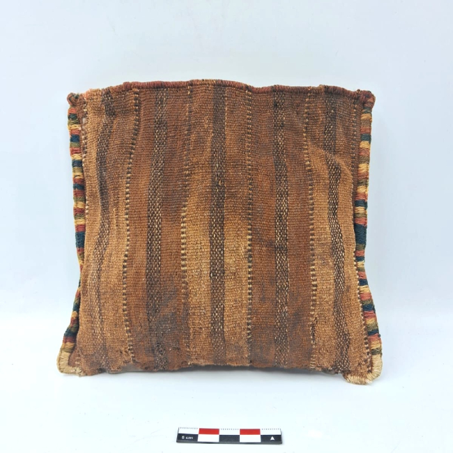 Chuspa rectangular confeccionada en lana de camélido y en técnica de faz de urdimbre. El cuerpo textil presenta un campo de color café claro irregular detacando tonalidades ocres. La decoración se organiza en bandas verticales de distinto ancho, con alternancia de listas más oscuras y claras. Algunas de estas bandas presentan un leve efecto de diseño interno, destcando alteranción de lineas horizontales cortas en dos tonalides de café y ajedrezado. Los bordes laterales están presentan un refuerzo u orillo policromo, donde se observan pequeñas franjas en tonos verdes, rojos, amarillos y azules. El refuerzo superior es monocromo y delgado.