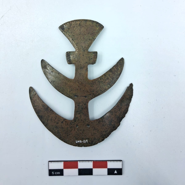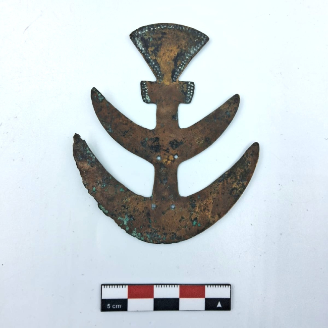 Adorno laminar de metal. La pieza presenta un cuerpo central alargado del cual se proyectan tres pares de apéndices laterales curvos, dispuestos de manera escalonada. El extremo superior remata en un ensanchamiento trapezoidal o en forma de abanico, mientras que el extremo inferior se abre en un amplio desarrollo semicircular con terminaciones apuntadas hacia los lados. En la superficie se observan perforaciones circulares dispuestas de manera regular en el eje central y en sectores laterales, las cuales habrían permitido su fijación a un soporte textil. Asimismo, presenta una serie de puntos o hendiduras perimetrales en el sector superior, probablemente realizadas por punzonado con fines decorativos.