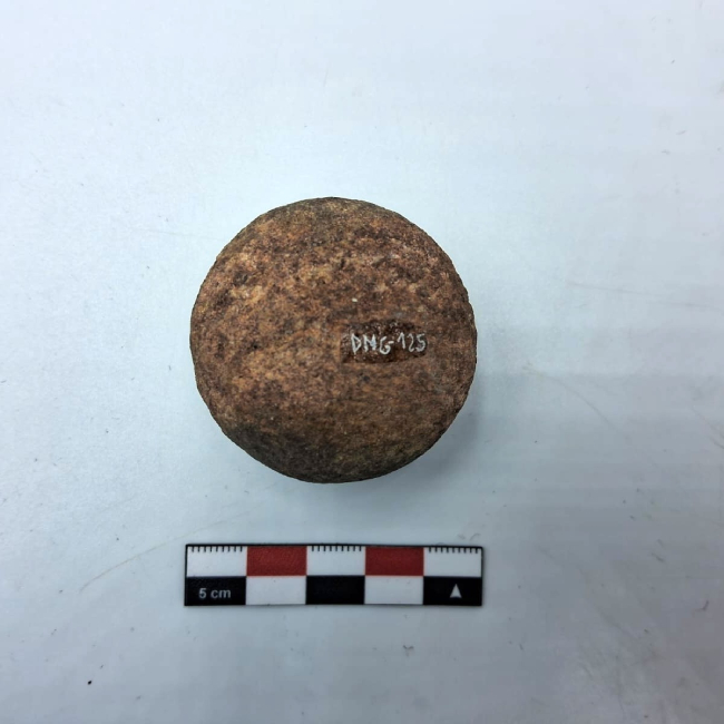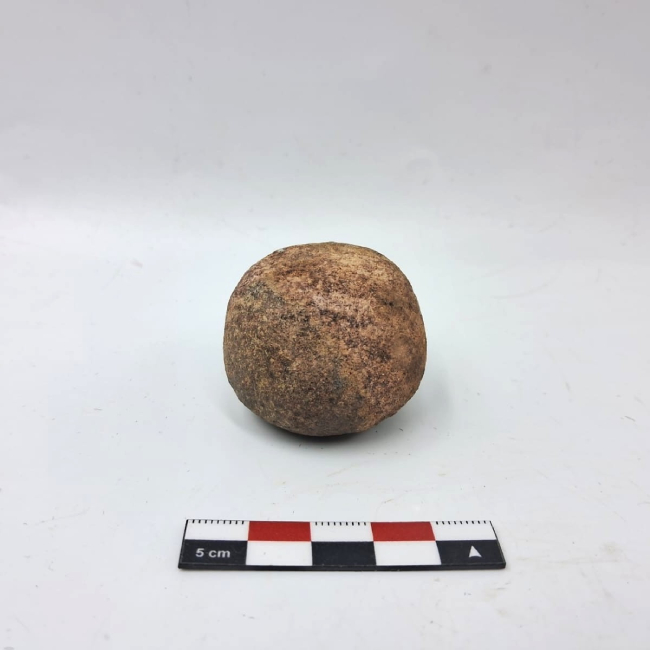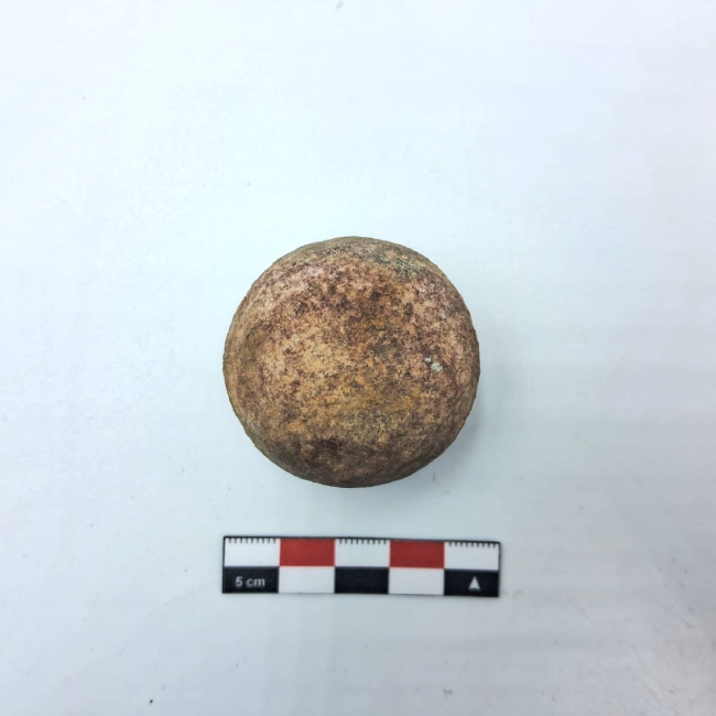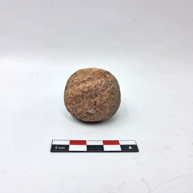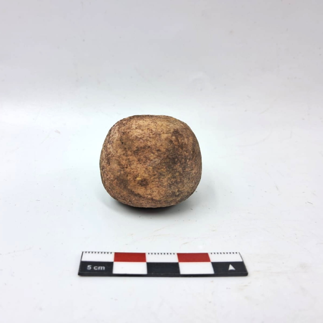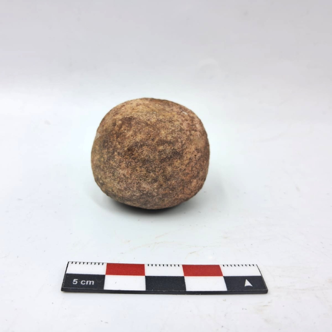 Bola lítica de forma subesférica, correspondiente a un componente de arma arrojadiza. Presenta contorno regular y superficie alisada, con evidencias de desgaste por uso. La materia prima corresponde a roca de grano fino. No se observan surcos ni perforaciones visibles para sujeción, lo que sugiere su uso mediante envoltura o amarre directo con fibras o cuero.