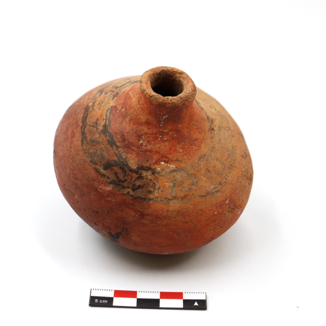Contenedor cerámico restringido dependiente. Presenta una forma general elipsoidal horizontal y base convexa. El cuello está conformado por bordes evertidos de labio redondeado y un leve refuerzo. En el sector superior , cerca del cuello, se ubica una banda anular delimitada por lineas paralelas en negro sobre fondo crema, dentro de esta banda se identifica un diseño de volutas. La vasija presenta engobe rojo en 3/4 de la superficie del cuerpo.