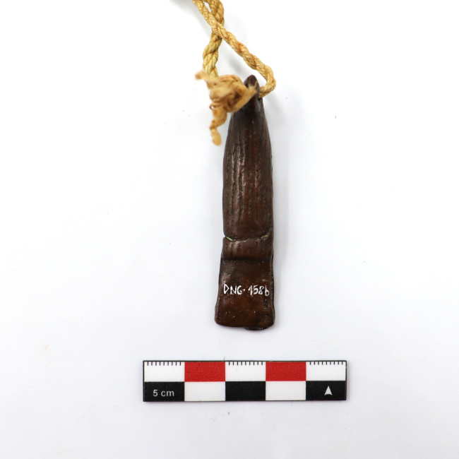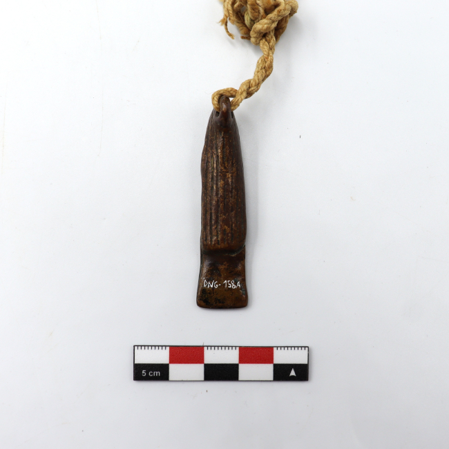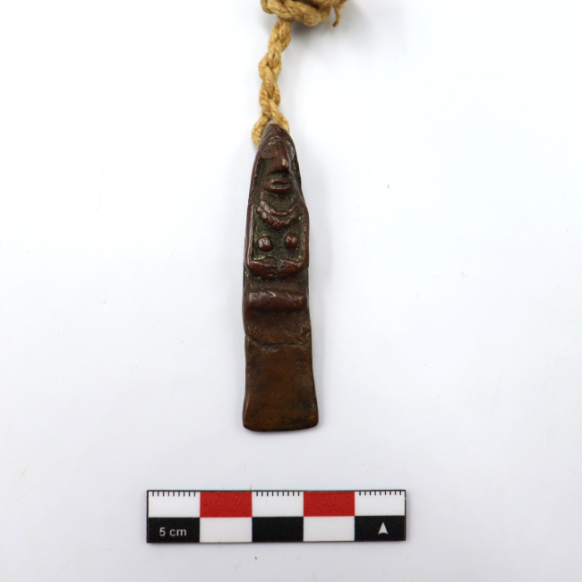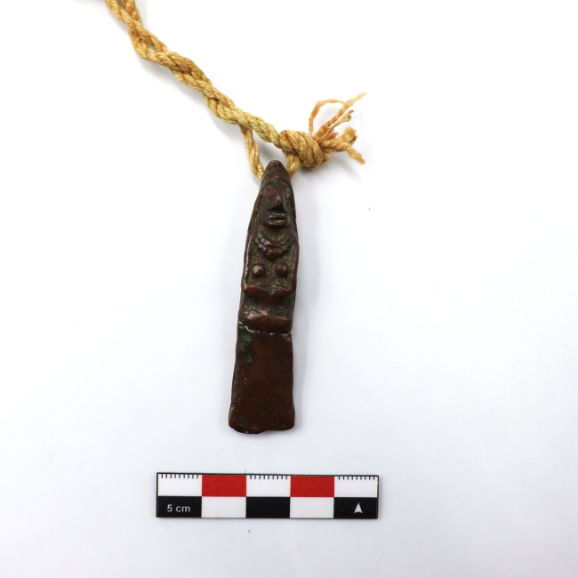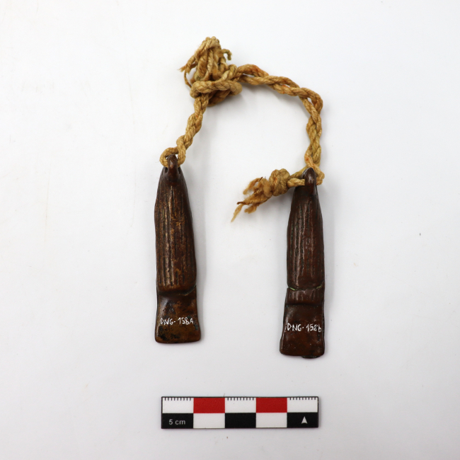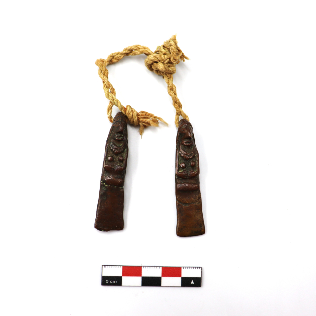 Par de figurillas antropomorfas femeninas y de metal que sirven para decorar peinados. Las figurillas representan un rostro de mujer con una nariz prominente y ojos y boca de forma ovalada. Visten un gorro tipo chullo con una prolongación en la parte de atrás que cubre toda la espalda de la figurilla y un collar de chaquiras. Presentan senos y sus manos se encuentran entrelazadas enfrente del cuerpo a la altura de la cadera. La terminación es oblonga y rectangular desde la cintura. Las figurillas están unidas una a la otra mediante un cordel de fibra de color natural. Este cordel está compuesto por dos cabos unidos por nudos. El primero presenta tres cabos de dos hebras cada uno, la torsión de este cordel es en Z . El segundo cordel está hecho con dos cabos de dos hebras cada uno. Esta torcido en Z.