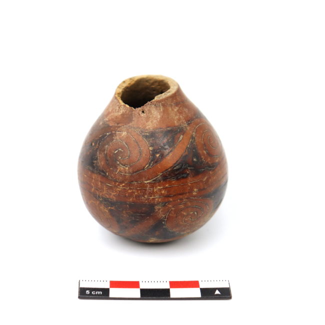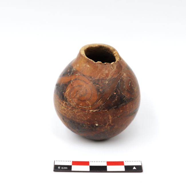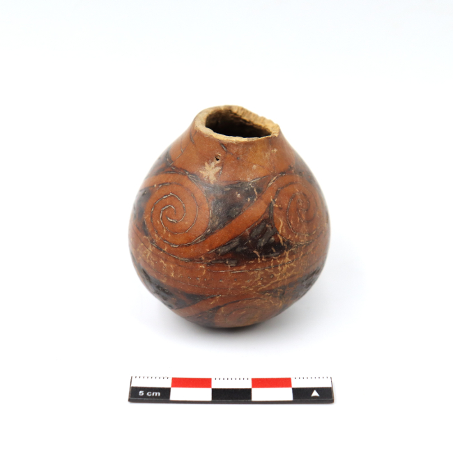 Olivares (2021) propone que las calabazas pirograbadas fueron un bien de prestigio en la Cultura Arica y que estas habrían sido utilizadas en ceremonias rituales relacionadas al consumo de chicha. El autor plantea que la técnica de pirograbado se realizaba a partir del uso de un objeto punzante expuesto a altas temperaturas con el que se iba grabando la superficie de la calabaza. El pirograbado se realiza a través de puntos muy cercanos unidos por líneas que configuran patrones geométricos, zoomorfos y antropomorfos. Olivares (2021) plantea que las calabazas utilizadas en el Norte Grande serían las del tipo Lagenaria siceraria. En la pieza se aprecia el diseño "efecto volutas" descrito como "triángulos opuestos de catetos curvos con gancho curvilíneo".