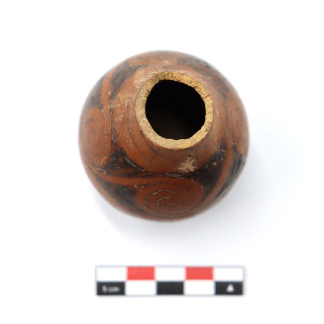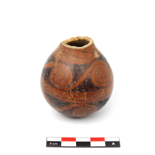 Contenedor de calabaza restringido simple. Su forma general es esférica y presenta bordes invertidos, labios planos y base convexa. La decoración consiste en motivos geométricos realizados en la técnica de pirograbado. De arriba a abajo se observa una linea anular delgada cercana al borde, una banda anular de volutas de fondo negro, una banda delgadada con decoración de puntos y otra banda de volutas de fondo negro. Cerca del borde se observan dos perforaciones simétricas pequeñas y un asterisco inciso.