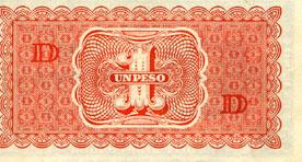 Reverso: Indica valor en letras (un peso) cruzado sobre numero (1) , de color rojo, sobre diseño achurado del mismo color.