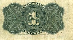 Billete de cinco pesos de la República de Chile, bidimensional, de formato rectangular y orientación horizontal, de color negro y rojo. Por el anverso se observa, al centro, la fachada de una construcción arquitectónica con ventanas arqueadas. A la izquierda un escudo y a la derecha un personaje masculino con bigote y barba. En el documento hay inscripciones de diferentes tipos y formatos, destacando dos sellos circulares en tinta de color negro y dos firmas manuscritas en la zona inferior. Por el reverso se observa un número uno al centro, con inscripciones, rodeado de filigrana de color verde.