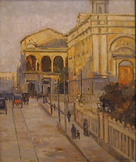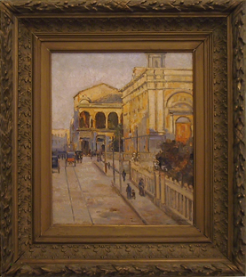 Obra de formato rectangular. Composición en base a paisaje urbano, con edificios de color amarillo, coches tirados por caballos, en primer plano a la derecha una reja y figuras humanas.