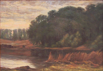Obra de formato rectangular. Composición en base a un paisaje rural donde aparece en primer en primer plano agua, pastizales; en segundo plano macizo de árboles al costado derecho. Al fondo se aprecia una hilera de árboles a la izquierda. El cielo se encuentra con nubes.