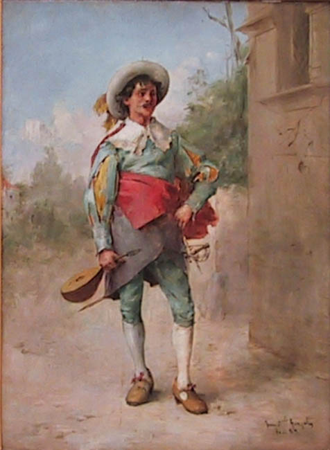 Obra de Formato rectangular. Composición en base a una figura masculina de cuerpo entero y de pie, con mano derecha sostiene un objeto, mano izquierda apoyada en la cintura viste traje celeste, sombrero con plumas y medias blancas.
