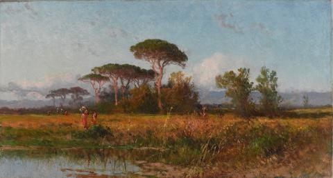Obra de formato rectangular. Paisaje campestre, con un grupo de árboles al centro de la composición, un cielo claro de color celeste y montañas al fondo. En primer plano se observan matorrales y un curso de agua, y en el cuadrante inferior izquierdo se observa a varios personajes, dos más cercanos al espectador y otros cuatro a la distancia que caminan en dirección al agua. Bastidor de madera, móvil, con dos cuñas en cada esquina.
