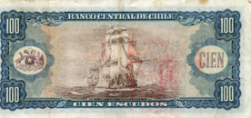 Reverso: Al centro imagen de un grupo de veleros en alta mar, de color café, bajo estos indica: ESCUADRA LIBERTADORA, a partir de un óleo por Thomas Somerscales. A la derecha ovalo blanco que señala: CIEN en color café, bajo esta palabra, aparece marca de agua con el perfil de un hombre. A la izquierda, ovalo blanco en el cual está inscrito un escudo de Chile. Margen Superior: BANCO CENTRAL DE CHILE. Margen Inferior: CIEN ESCUDOS. En cada esquina aparece un número 100 en color blanco. Todo el diseño es de color azul.