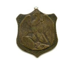Objeto en forma de escudo de color dorado con pátina. Al anverso se observa la figura en sobrerelieve de un ave posada sobre un elemento ovalado, con las alas ligeramente extendidas. El reverso es liso.