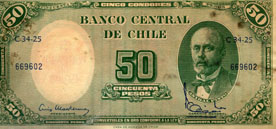 Anverso: De color verde. Al centro texto que indica valor y denominación del billete: 50 - CINCUENTA PESOS. Sobre esto indica: BANCO CENTRAL DE CHILE. En el margen superior señala: CINCO CONDORES. En el margen inferior: CONVERTIBLES EN ORO CONFORME A LA LEY. Bajo esta inscripción, señala impresores: CASA DE MONEDA DE CHILE. Al lado derecho del texto central, retrato de hombre, vestido de civil, con corbata de lazo, barba y frente amplia. Bajo la imagen, indica: ANIBAL PINTO. A la izquierda del texto central, ovalo blanco en cuyo interior está la marca de agua o filigrana, del retrato de perfil de un hombre. Bajo las imágenes, se encuentran dos firmas de color azul, la del Presidente (Eduardo Figueroa) y la del Gerente General (Ibañez). En los extremos opuestos (der. E izq.) se ubican los números de serie de color azul. En cada esquina se encuentra un número 50 en color blanco.