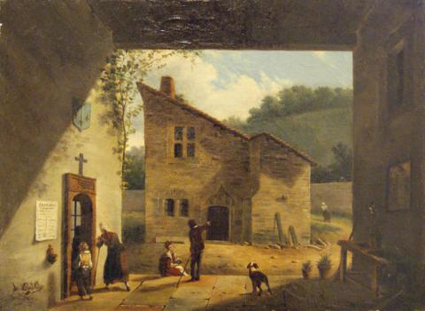 Pintura de formato rectangular y orientación vertical. Se observa un paisaje exterior con construcciones de piedra de 2 pisos, visto desde un interior o zona más oscura. Existe una figura femenina junto con un niño en el costado izquierdo, un hombre y una mujer con una niña en brazos en el sector central, y un perro al costado derecho en el mismo plano. Más atrás se ve una mujer de espaldas. Al fondo se observa un cerro con árboles y un cielo con nubes.