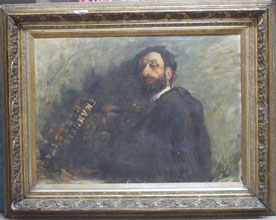 Obra de formato rectangular. Composición en base a figura masculina de medio cuerpo, medio perfil. Lleva barba y bigotes. Viste traje oscuro.