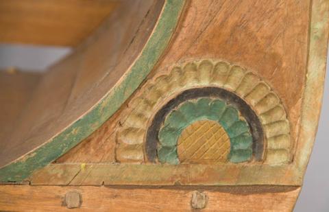 Mueble de asiento para varias personas, de uso en exterior. El respaldo está compuesto por un rectángulo tallado al centro, con elemento fitomorfos asimétricos, rematado con un arco en la zona superior, con una flor tallada al centro, flanqueada por dos aves. A cada uno de los lados lados del rectángulo hay seis barrotes torneados. Los brazos son curvos, rematados en voluta hacia el interior. Las cuatro patas son curvas, rematadas en voluta hacia el exterior.