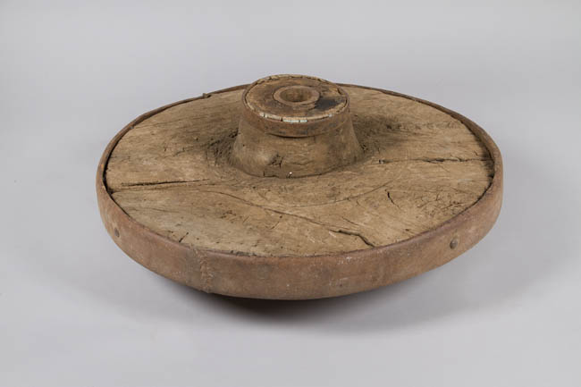 Objeto de madera con forma de disco, tallado de una sola pieza. Al centro presenta una estructura circular más pequeña, sobresaliente por ambas caras. Esta estructura presenta una perforación al centro que traspasa ambas caras.