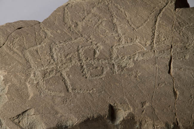 Bloque de piedra, color gris/marrón, de superficie irregular con dibujo inciso en una de sus caras. El dibujo está elaborado con líneas que forman una representación geométrica abstracta.