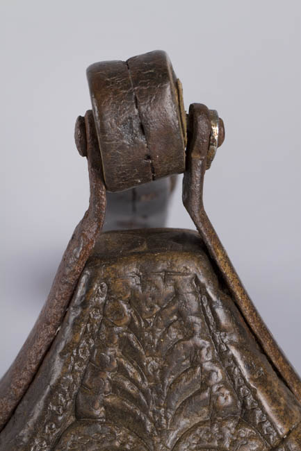 Par de objetos de madera tallada, en forma de prisma triangular achatado en el extremo superior y de punta redondeada en la zona frontal. La talla muestra diseños fitomorfos de hojas y espigas. Cada uno lleva llanta metálica con ataujía con diseños de rombos y cruces. En el pasador de la llanta, ubicado en la parte superior, se fija ación de cuero rematado con una hebilla metálica.