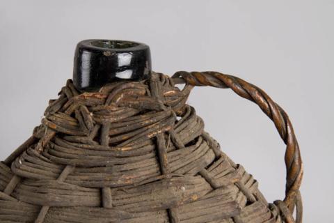 Contenedor de vidrio de color verde, de cuerpo cilíndrico con un cuello estrecho, revestido completamente en tejido vegetal, con un asa lateral en la zona superior.