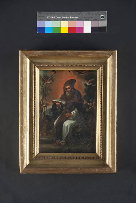 Obra de formato rectangular. Composición en base a una figura masculina de anciano, tiene barba y bigote cano. Está vestido con un hábito de tono café y blanco. Se encuentra sedente y con mano derecha sostiene un libro que observa y en su mano izquierda un bastón.