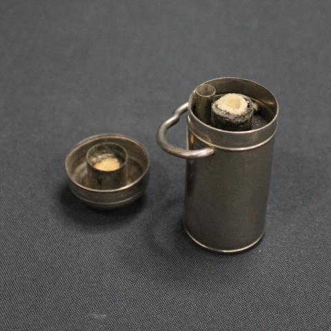 Objeto utilitario para transportar tinta para escribir. De forma cilíndrica, elaborado en metal de color plateado, compuesto por contenedor y tapa convexa con pequeña hendidura circular al centro. La tapa se fija mediante un seguro que la presiona desde la parte superior. Al interior tiene divisiones circulares.
