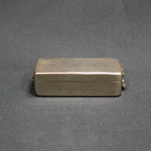 Caja niquelada de volumen rectangular, con broche para cerrarla en uno de sus lados cortos. La parte inferior del interior está revestida en opalina de color blanco. El interior de la parte superior está revestido con lámina de corcho.