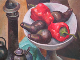 Naturaleza Muerta, Salamandra con Tetera y Pimientos.