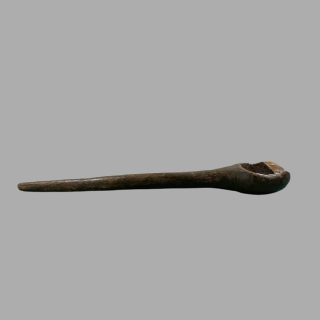 Herramienta culinaria elaborada en una sola pieza en madera, usada en contexto doméstico en la preparacion de comidas. Es de color marrón oscuro y superficie pulida. Tiene un mango recto, de sección ovalada y cantos redondeados, ligeramente aguzado hacia uno de sus extremos. El extremo opuesto es un receptáculo de forma globular y cóncavo.