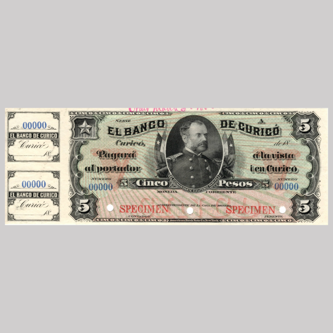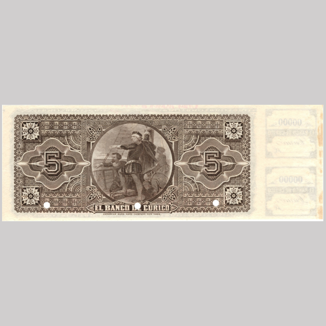 Specimen de cinco pesos del Banco de Curicó, bidimensional, de formato rectangular y orientación horizontal. Por el anverso, se observa al centro una imagen ovalada de un personaje masculino, de medio perfil, medio cuerpo y con uniforme militar. El billete tiene filigrana de colore verde, rojo y negro, y presenta texto en color negro, rojo, blanco y azul, en distintas tipografías. Por el reverso tiene un diseño en filigrana de color marrón. Al centro, enmarcado en un círculo, se representa una escena en la que se observan personajes que observan desde la cubierta de un barco. A la izquierda y derecha del círculo, se muestra el número 5, y ornamentos geométricos decorativos. En la zona inferior del reverso, bajo la escena representada hay texto de color blanco en cartela horizontal.
