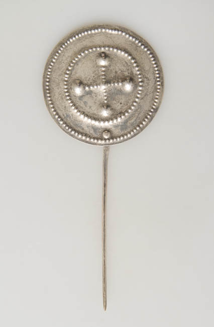 Adorno pectoral de uso personal femenino de forma oblongo. Está compuesto por un disco y una aguja. El disco se encuentra decorado en los bordes y en el interior con inciso lineal en dos círculos concéntricos y cruciforme en el centro. Color plateado brillante.