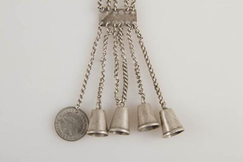 Adorno de uso personal femenino que se usa en el pecho. Está compuesto por tres placas rectangulares pequeñas de las cuales penden cuatro series de seis cadenas. En la última placa, las están decoradas con cuatro pendientes campanuliformes realizados con dedales y un adorno discoidal en el centro.
