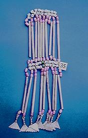 Adorno personal de uso femenino que se usa en el pecho. Se encuentra conformado por dos series de nueve y diez tubos divididos por cuentas de plata y vidrio rosado. En el sector inferior se encuentra decorado con nueve adornos triangulares de base dentada. Color plateado.