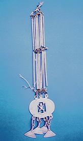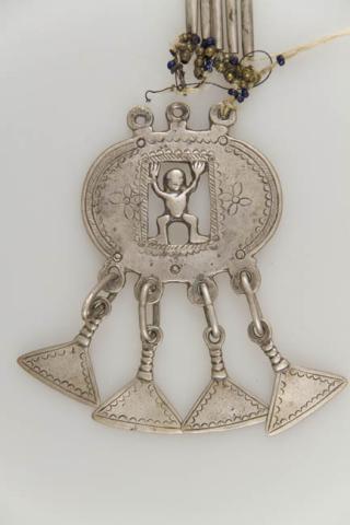Adorno personal de uso femenino que se usa en el pecho. Se encuentra conformado por dos series de siete tubos divididos por cuentas de plata. El sector inferior es una placa discoidal que tiene en el centro un calado con figura antropomorfa con brazos y piernas extendidas. De la base penden cuatro adornos triangulares.
