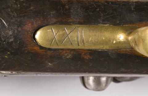 Arma de fuego portátil de mano, con sistema de avancarga. Compuesta de caja, mecanismos y caña. Caja de madera con coz de bronce, garganta rota y caña rematada en pieza cóncava de bronce. Mecanismos de acero: de disparo y llave de pedernal. Cañón de acero recto de ánima lisa, con pequeño punto de mira bañado en bronce en su extremo. Guardamonte y cepote de bronce. Con trompetilla de bronce adosado a la parte inferior de la caña.