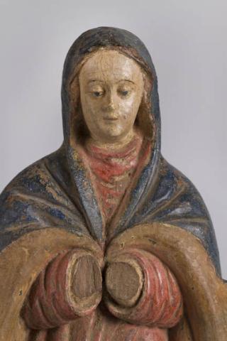 Representa a un personaje femenino de pie, sin manos. Traje rojo y manto azul que le cubre la cabeza.