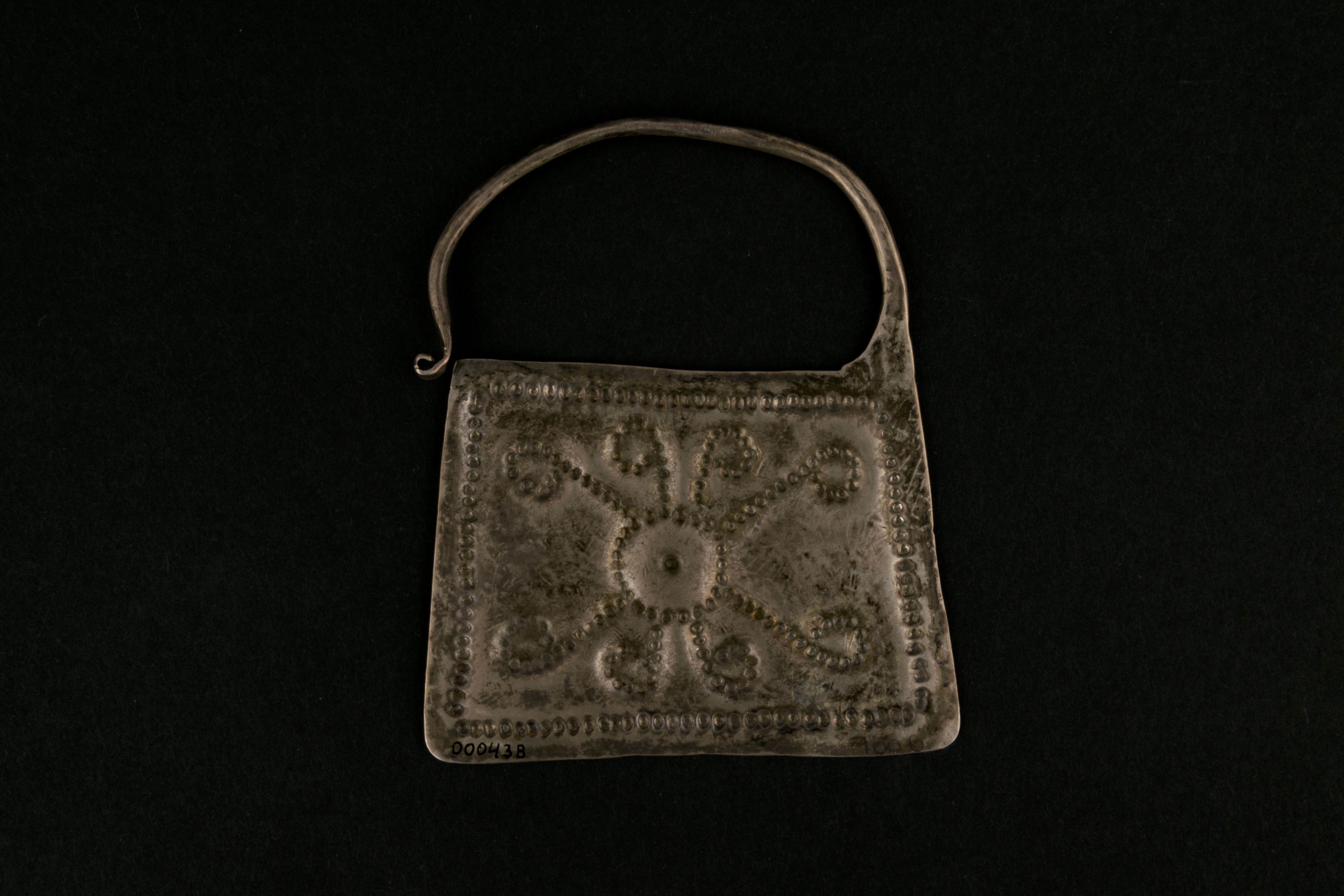Así mismo posee decoración en su placa con técnica de repujado que consiste en hileras punteadas por todo el contorno de la pieza formando un rectángulo. A su vez en el centro de la placa con la misma técnica presenta una decoración fitomorfa compuesta por un círculo con un punto en el centro, con ocho brazos de hileras con punta ondulada, siendo las diagonales más largas que las otras.