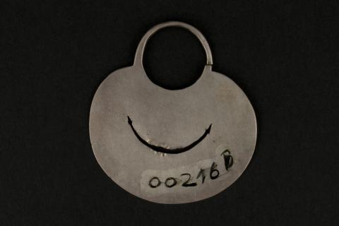 La pieza discoidal posee un orificio circular en su parte superior con una apertura lateral que corresponde al gancho para colgar del lóbulo. Al comienzo y final del gancho se encuentra cincelado un pequeño círculo. Así mismo posee también en el centro de la placa una perforación en forma de medialuna alargada, angosta y horizontal, decorada en su curvatura superior e inferior con líneas buriladas en forma de espiga. Junto a la decoración de espiga de la parte inferior también se presentan líneas cinceladas con motivo de medialunas.