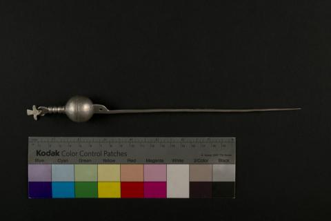 Alfiler de plata con cabeza esférica formada por dos semiesferas unidas al centro con soldadura y decorado a partir de cincel con líneas diagonales continuas por todo el ecuador o línea central. La parte inferior de la esfera presenta un rotulado con plumilla en tinta china negra con el número 00182.