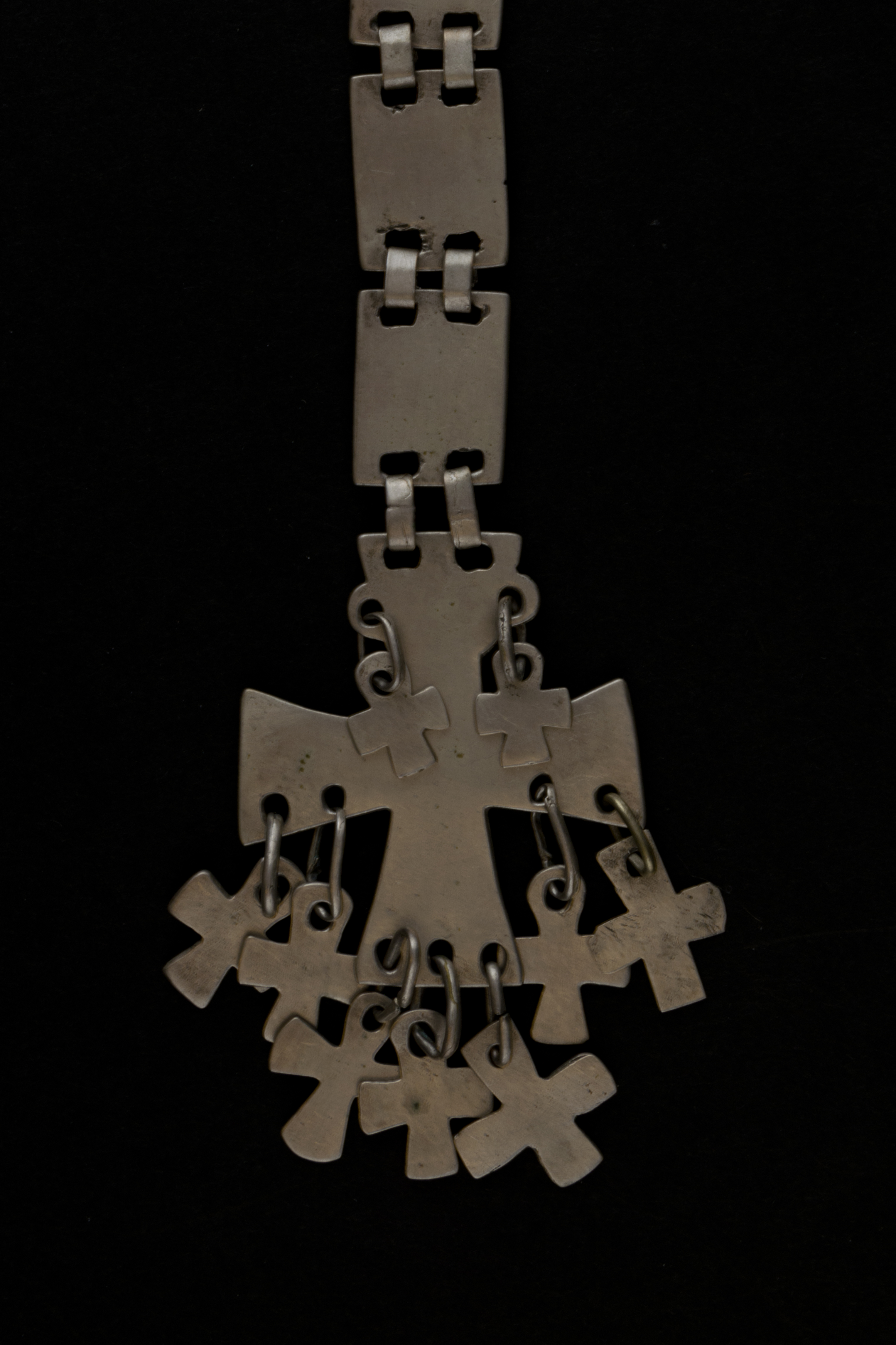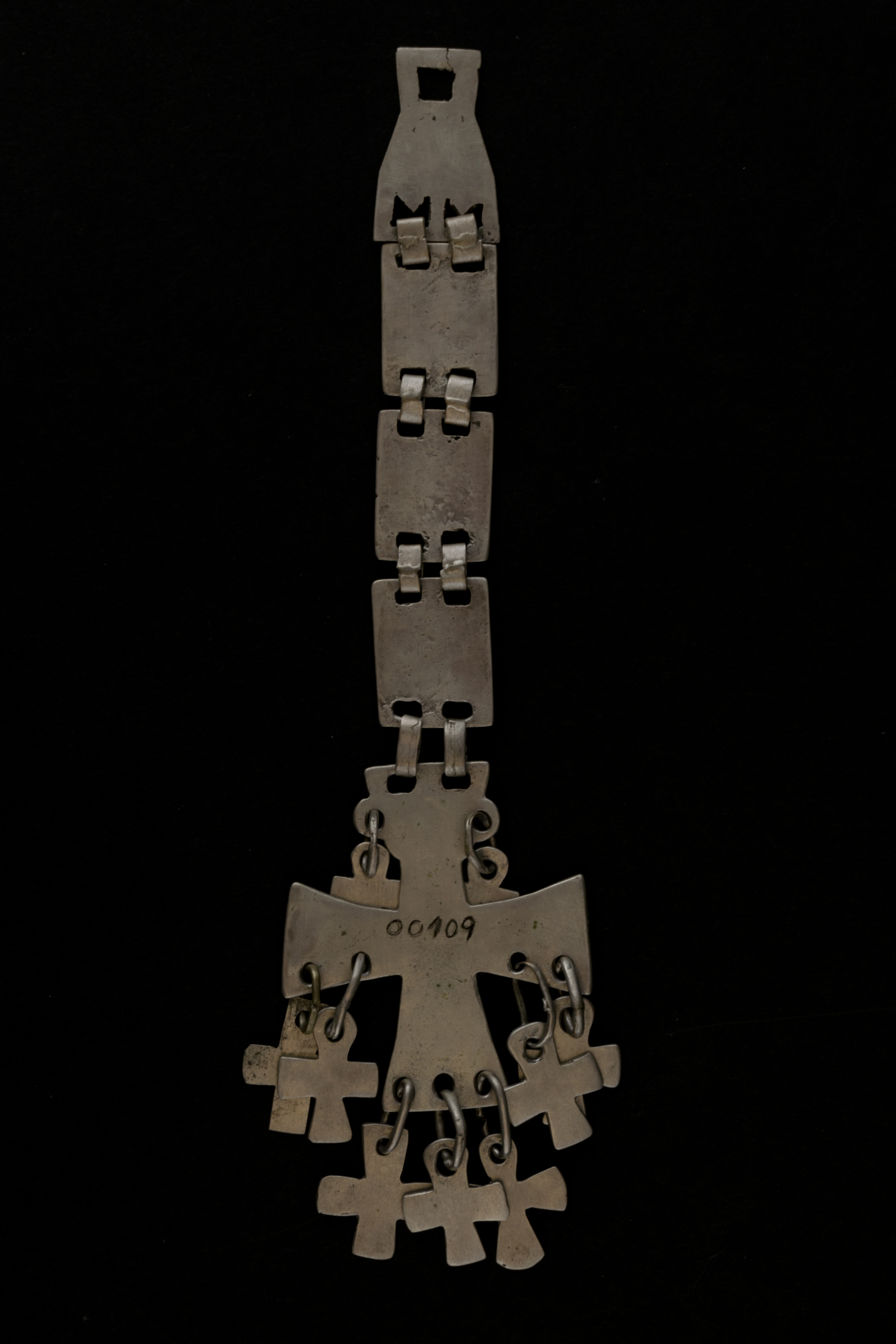 Esta trapelakucha de 21 cm. de largo corresponde a una joya pectoral del ajuar de la mujer mapuche. A grandes rasgos, consiste en una estructura modular de 5 placas, 8 eslabones y 9 colgantes cuyas formas se asemejan a la cruz de malta.