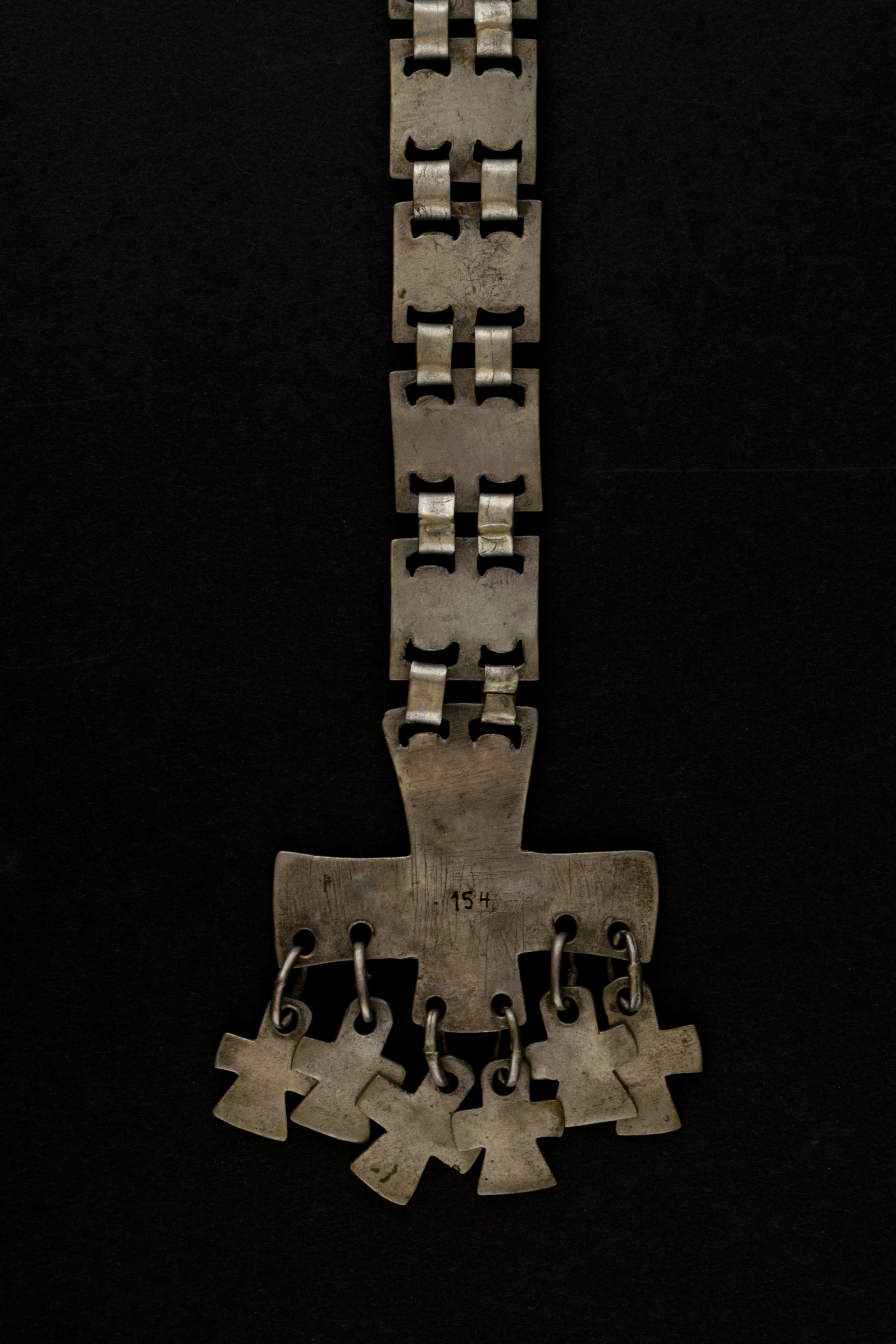 Esta trapelakucha de 27,7 cm. de largo corresponde a una joya pectoral del ajuar de la mujer mapuche. A grandes rasgos, consiste en una estructura modular de 9 placas unidas por 22 eslabones y 6 colgantes cuyas formas se asemejan a la cruz de malta.