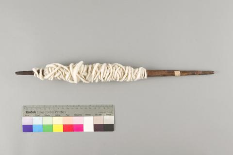 La pieza se compone de dos partes. La primera de ellas corresponde a un instrumento lítico de forma cilíndrica regular, de bordes redondeados y perforación en el sector central. La segunda es un instrumento de madera tallada para hilar, de forma alargada y sección circular, sus extremos son agudos y superficie pulida.