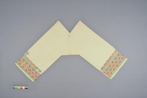 Pantalón confeccionado de tela cruda de algodón en forma de dos piezas trapezoidales para las piernas y dos piezas triangulares dobles (anverso y reverso) para la entrepierna. Las costuras empleadas corresponden a puntadas diagonales con hilo crudo de algodón. Los extremos inferiores de cada pierna están decorados con bordados en punto cruz representando formas geométricas y fitomorfas con hilo de color verde, anaranjado, café, rojo y azul.