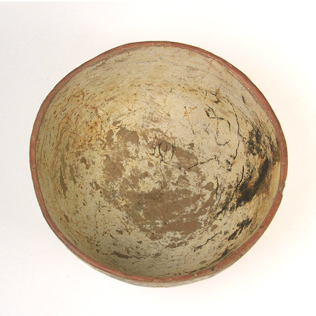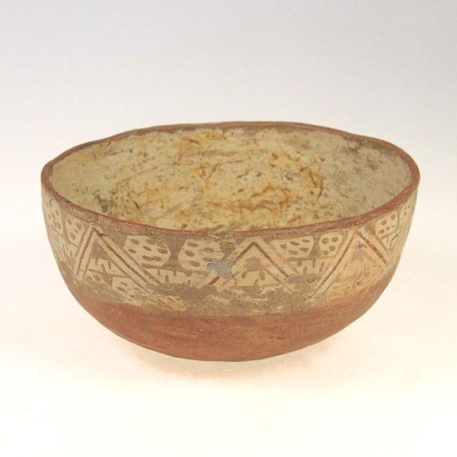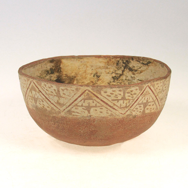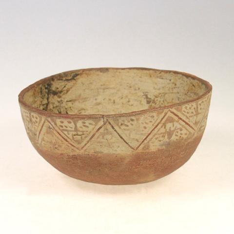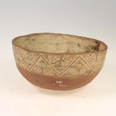 Contenedor no restringido, simétrico y de perfil simple. Tiene un cuerpo semiesférico, con borde directo. El interior está engobado de color blanco, mientras que en el exterior posee una banda decorativa en la cual se despliega una variación del patrón Zigzag L (según González, 2013), que remite a un rostro indeterminado de forma triangular, conformado por dos ojos y una boca en los cuales hay puntos en traslación.